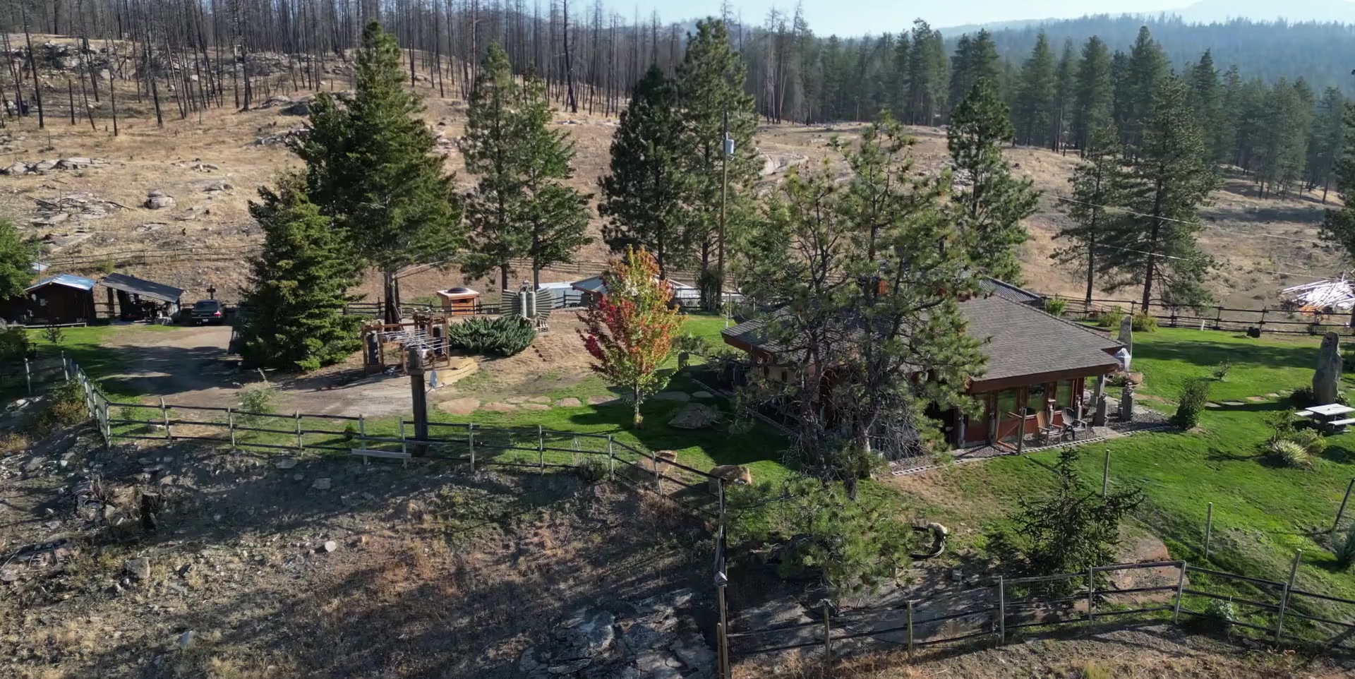 The space is further accented by multiple, oversized, natural rock installations, enclosed gardens and chicken coops, and various outbuildings for storage and vehicle shelter.